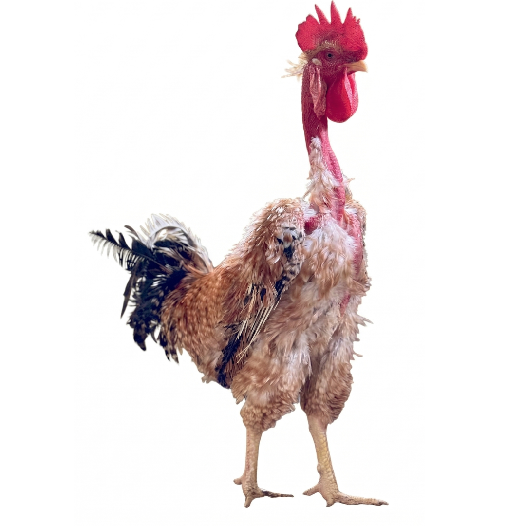 Ave de porte médio, com plumagem frisada, onde as penas são curvadas para fora, criando um visual único e chamativo. Mantém comportamento ativo, rústico e boa adaptação a diferentes sistemas de criação, sendo ideal para sítios, chácaras e projetos ornamentais, sem perder o vigor característico da linhagem Label Rouge.